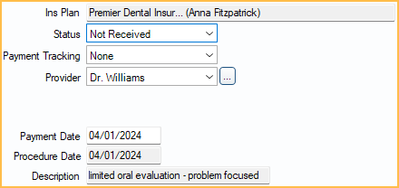 Insurance Paid: The actual amount insurance paid on the procedure. Entered when receiving a claim. Cannot be edited once the procedure is attached to a check.