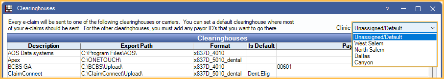 When sending claims for Clinics, the clinic-level overrides are used instead of default settings and are determined by the claim's assigned clinic. Default dental or medical clearinghouses remain the same for all clinics.
