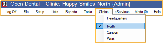 In the Main Menu, click to view a dropdown of available clinics for the logged-on user.