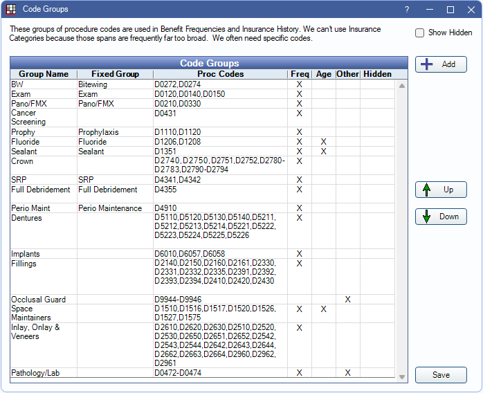 Click Save to show changes in the Code Groups grid. Duplicate procedure codes are not saved (e.g., if D0474,D0474 is entered, only D0474 is saved).