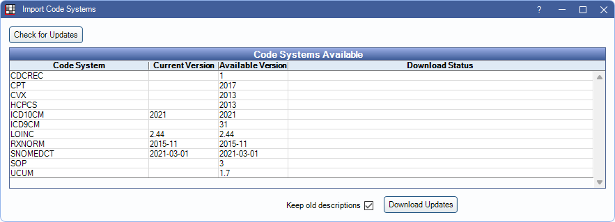 Check for Updates: Click to view a list of code systems available for import.