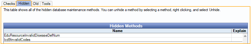 Each database maintenance method can be hidden so it no longer shows in the list of Database Methods. This can be useful for methods an office doesn't use.