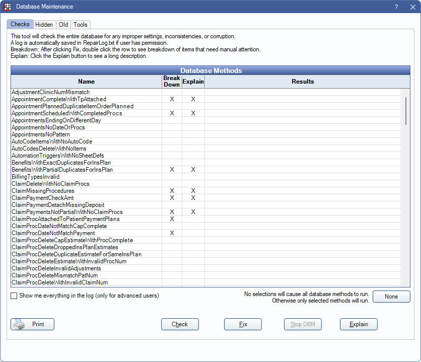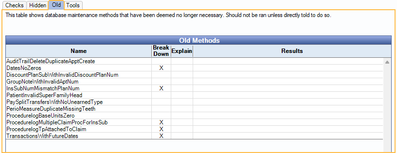 Database maintenance methods that are no longer needed or outdated are moved to the Old tab. Methods can still be run from this window, but only do so if instructed by Open Dental Support as they can be unnecessary and time consuming.