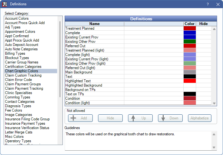The Chart Graphic Colors definition determines the colors used on the Graphical Tooth Chart.