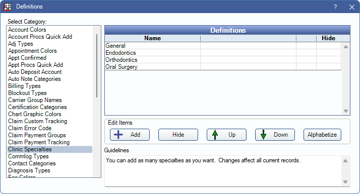 The Clinic Specialties definition determines the list of specialty options available to assign to a Clinic or patient in the Edit Patient Information window. They are useful when used to differentiate Patient Clones. This list is empty by default. Add Clinic Specialties as needed.
