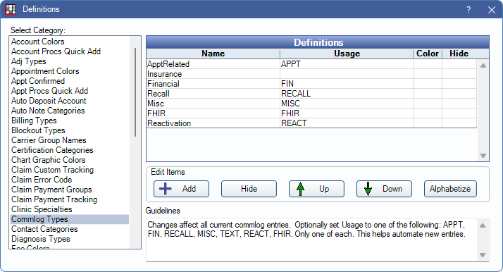 - RECALL: Enter RECALL to set this as the default type when a recall status is selected from the Set Status dropdown or Comm is clicked on the Recall List. Commlogs created with this type will count towards the number of reminders a patient has received.