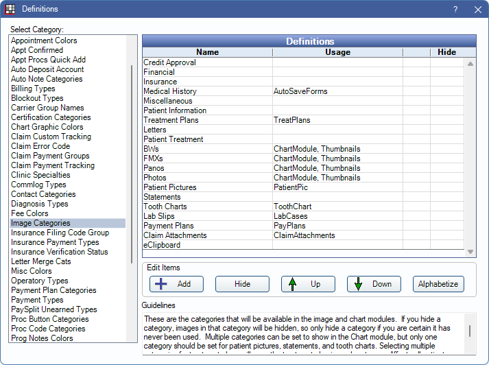 The Image Categories definition determines the category folders available to organize documents in the Imaging Module.