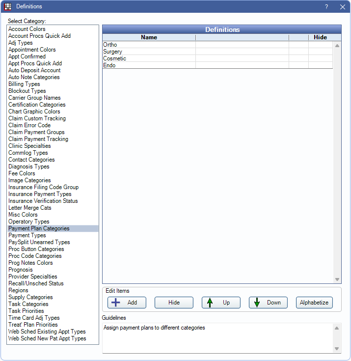 The Payment Plan Categories determine the list of category options available for Payment Plans, Insurance Payment Plans and Old Payment Plans. This list is empty by default. Add new categories as needed.