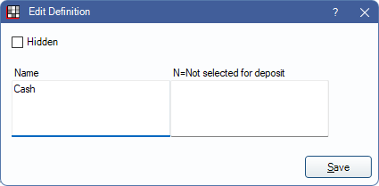 N=Not selected for deposit: Enter N to exclude this type from deposit slips or leave blank to include this type.