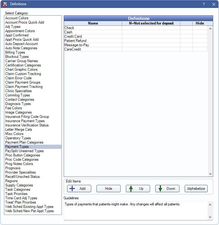 The Payment Types definition determines the list of patient payment type options available in the Edit Payment window.