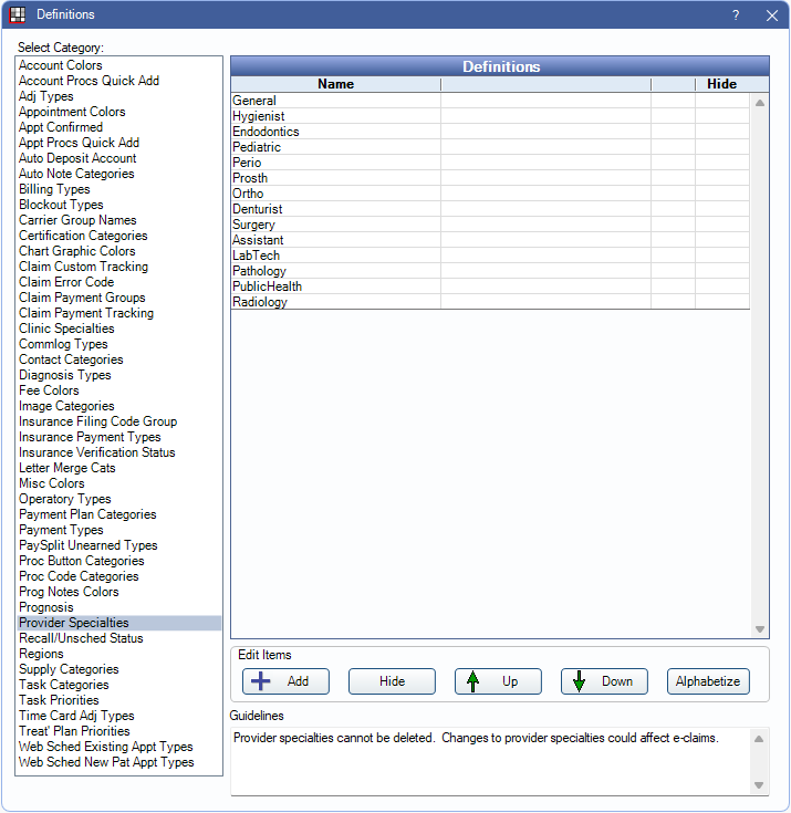 The Provider Specialties definition determines the list of specialty options available in the Provider Setup and Edit Referral windows.