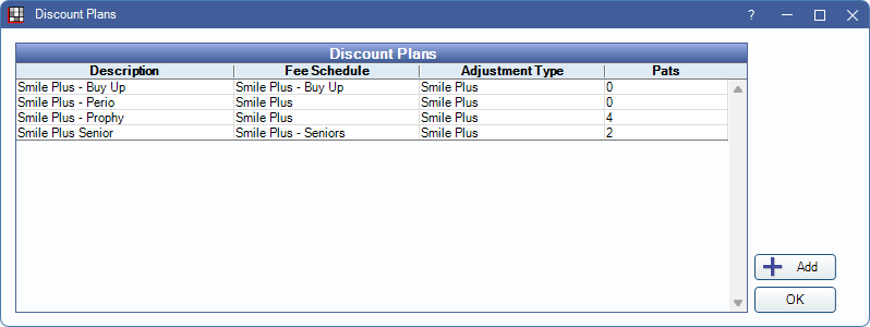 In the Family Module toolbar, click Discount Plan. The Discount Plans list displays.