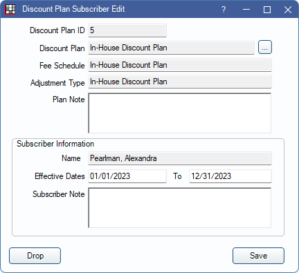Once a plan is selected, make any necessary changes to the Plan Note and Subscriber Information on the Discount Plan Subscriber Edit window.