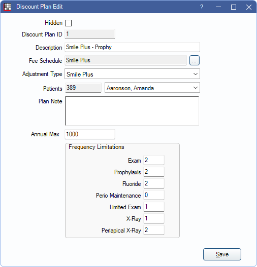 - Frequency Limitations: (optional) Enter frequency limitations for the plan. Leave blank for no limitation. Codes must be entered in Preferences, Discount Plan Frequency Limitations for limitations to calculate.