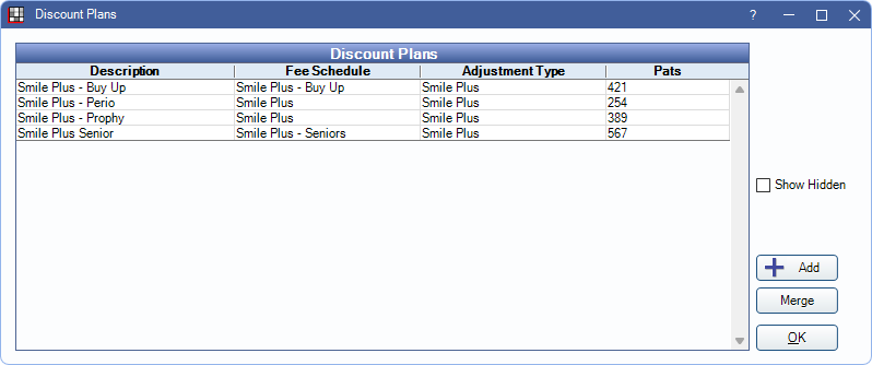 - Hidden: Only displays when Show Hidden is checked. An X displays for Discount Plans marked Hidden.