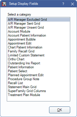 - Ortho Chart: Columns in the lower grid of the Ortho Chart. This setup is different than other display fields.