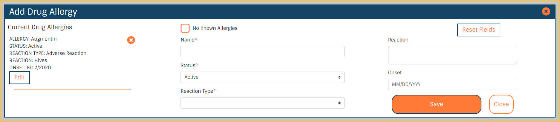- Allergy: Begin typing the drug name and a list appears. Select the correct drug from the list.