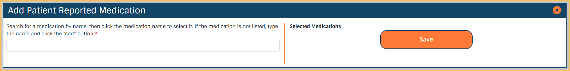 - In the Search field, begin typing the medication name and it appears. Select the correct medication from the list. If the medication does not appear, manually enter it and click Add.