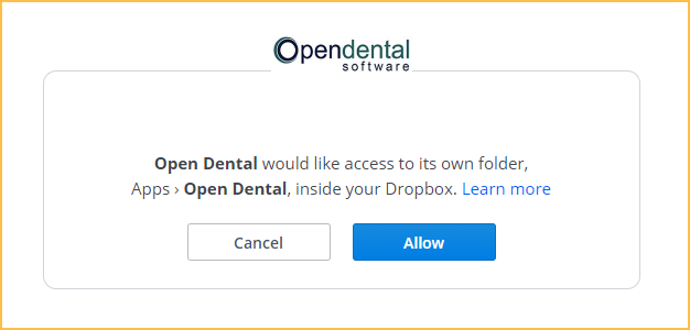 - Once signed into the account, Dropbox prompts to allow Open Dental to access its folder in Dropbox.