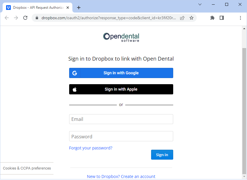 - Click Authorize Dropbox to set up a Dropbox account or authorize Open Dental access. A Dropbox sign in page opens in the default web browser.