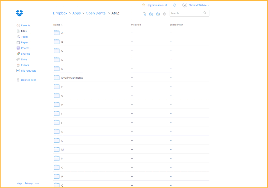- Create a mirror copy of the A to Z folders in Dropbox, Apps, Open Dental. Refer to Dropbox Help Center for instructions.