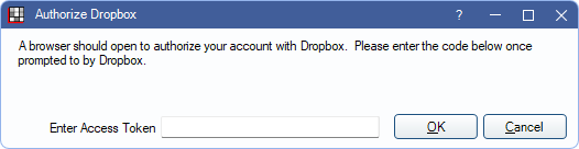 - An access code shows on the screen. Enter it in the Enter Access Token box of the Authorize Dropbox window. Click OK to save.