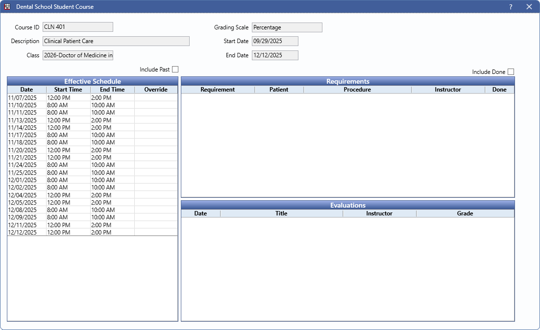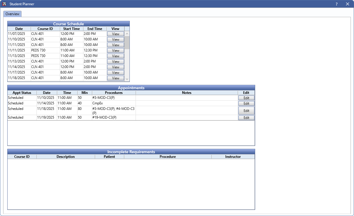 Only available when Dental Schools is enabled in Show Features and the logged on user is a student. Use the Overview tab to track courses, appointments, and incomplete requirements.