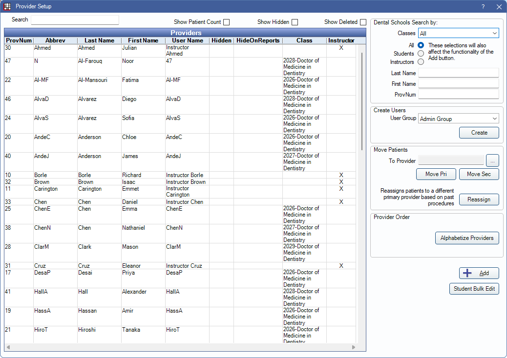 Add: Create a new provider. See Dental School Instructors or Dental School Students for instructions on create Students or Instructors.