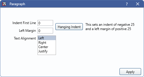 - Indent First Line: The amount of space to indent the first line of the selected paragraph.