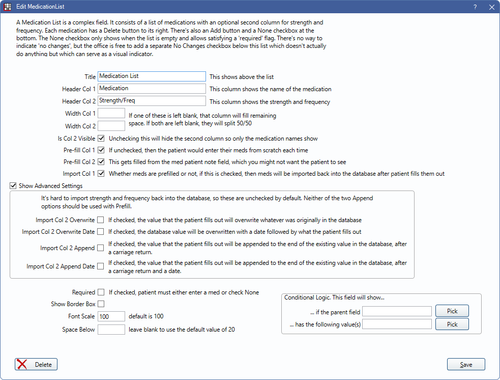 - Pre-fill Col 1: Check to pre-fill the medication list from previous forms. Uncheck to require patients enter their medications each time.