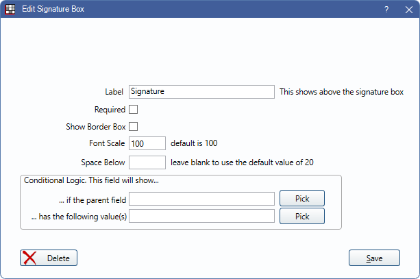 Label: Add a label to describe the signature box (e.g., Signature). Labels are bold when Labels Bold is checked in eForm Def Properties.