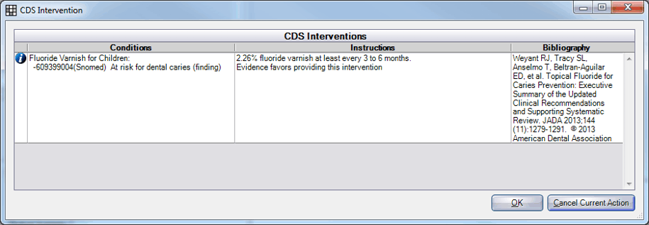 CDS interventions provide evidence-based clinical guidance when a user is making a clinical decision. If a user has the appropriate EHR CDS Permissions and enters data for a patient that triggers a CDS Rule, an intervention will pop up on-screen.