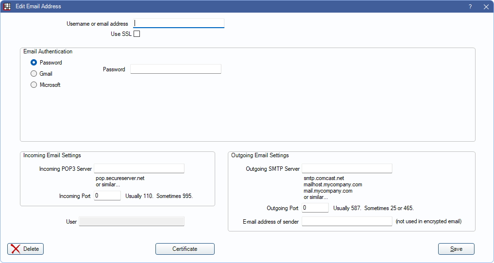 Outgoing email settings are required to send email from Open Dental. These settings are only enabled when Password is selected as the Email Authentication option.