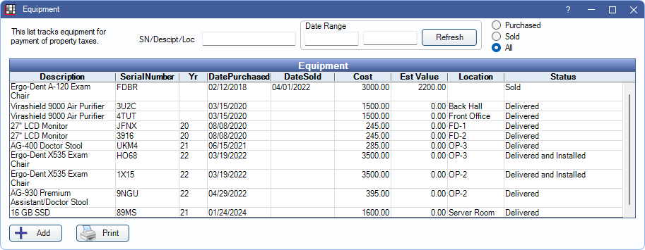 Purchased, Sold, All: Filter the equipment view by selecting the radio button. When All is selected, items with a DatePurchased or DateSold in the selected date range display.