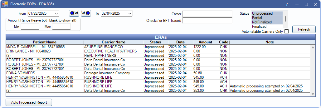 - To see ERAs that have been automatically processed and finalized, open the ERAs window. Select the Finalized status filter. ERAs that have been finalized by automatic process display a note. A note also indicate any failed auto processing attempts.