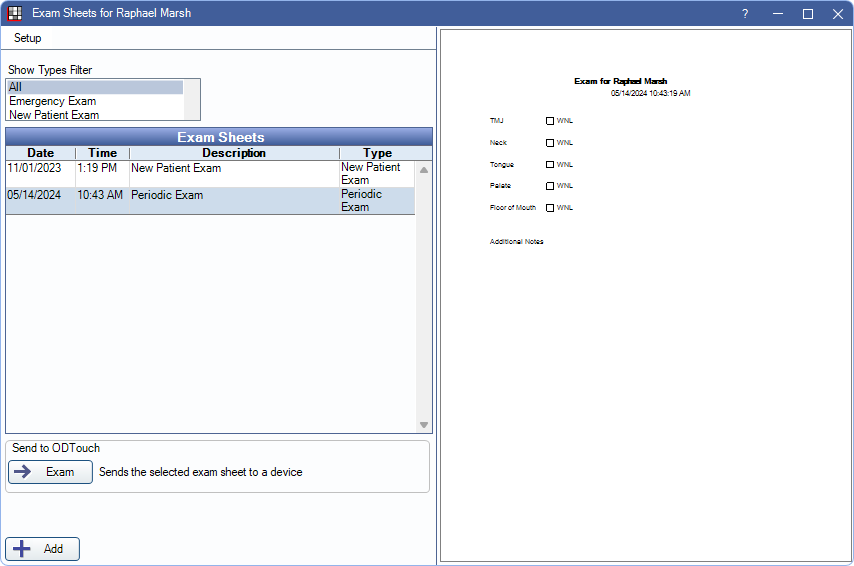 Add: Click to generate a new Exam Sheet for the patient. See the following section for more details.