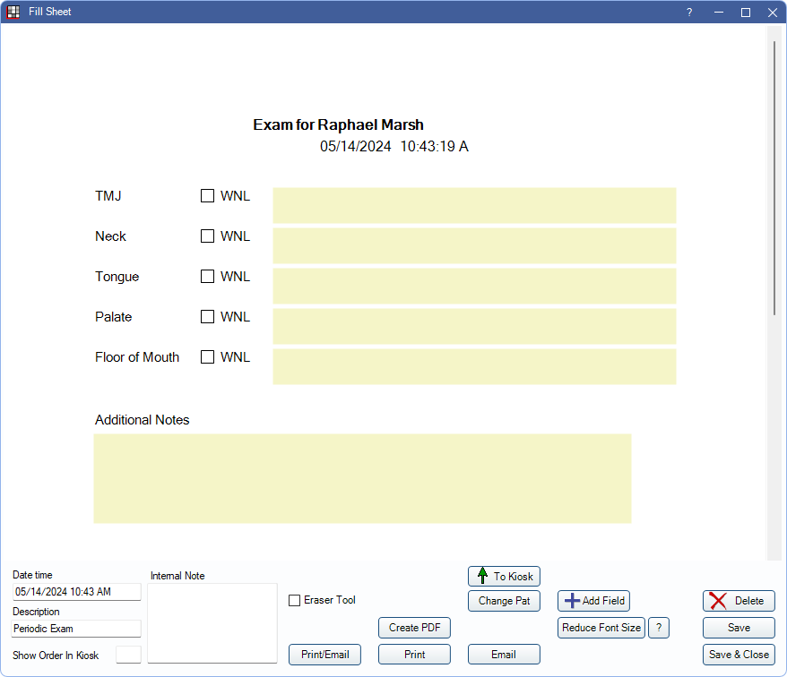 Below is an example of the internal Exam Sheet. Pale yellow areas indicate data entry areas.