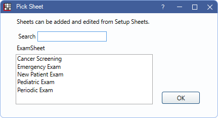 Click Add to create a new Exam Sheet. Pick Sheet opens. Double-click an existing sheet to edit. Fill Sheet opens.