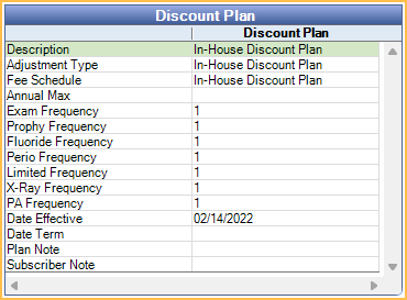 This area replaces the Insurance Plans area when a Discount Plan has been attached to the patient. Double-click the plan to open Discount Plan Subscriber Edit, or change or drop the plan.