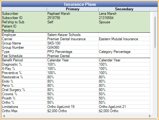 The Insurance Plans area displays all insurance plans currently attached to the patient. A nearly unlimited amount of plans can be attached (primary, secondary, tertiary, primary medical, secondary medical, etc.) Change the background color of Subscriber information in Definitions, Misc Colors. Double-click on any plan to open Edit Insurance Plan to view details or make changes.