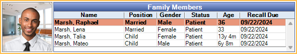 Patient Recall information is displayed to the right of the Family Members grid. This area lists all recalls due and scheduled for the patient.