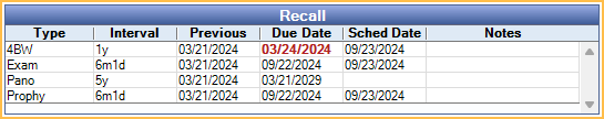 Displayed columns can be customized in Display Fields, FamilyRecallGrid. Double-click anywhere in the Recall area to open Recalls for Patient to edit recall details.