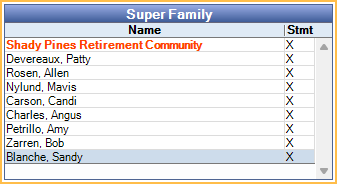 This grid only shows when the selected patient is part of a Super Family. It lists all Super Family members. Customize which fields are shown here in Display Fields, SuperFamily Grid Columns
