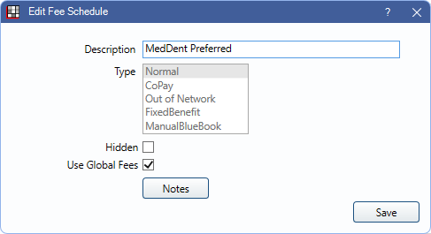 - Use Global Fees: Set whether the fee schedule only allows a single (global) fee per procedure, or allows Fee Overrides for Provider or Clinic.