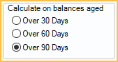 Calculate on balances aged: Select the age of the accounts that should have charges applied. When calculating finance charges, only balances over the selected age are considered (e.g., if Over 90 Days is selected, outstanding balances aged less than 90 days do not affect the calculated finance charge amount).