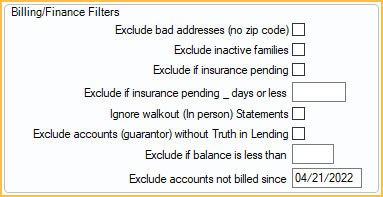 Select options to have to exclude accounts from being billed finance or billing charges.