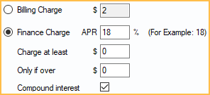 Finance Charge: Select to apply finance charges and apply a percentage charge (APR) to account balances. Charges are added to accounts as an adjustment using the Finance charge adj type. Set the following options before applying charges:
