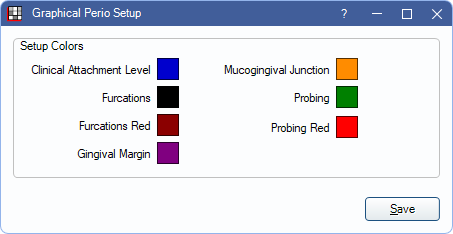 Setup Colors: Click to open Graphical Perio Setup. Click a colored box to open the Color picker to change the color of the corresponding graphic. Changes are global.