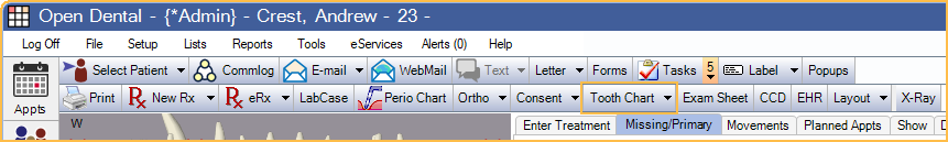 - Teeth can be selected from the Graphical Tooth Chart to chart procedures from the Enter Treatment tab or mark teeth missing/not missing from the Missing/Primary Teeth tab.