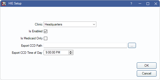- Export CCD Time of Day: Enter the time of day to export CCDs. The Open Dental Service is required for CCDs to be created and exported. The Open Dental Service processes HIE queues every 5 minutes for 1 hour beginning at the time entered.